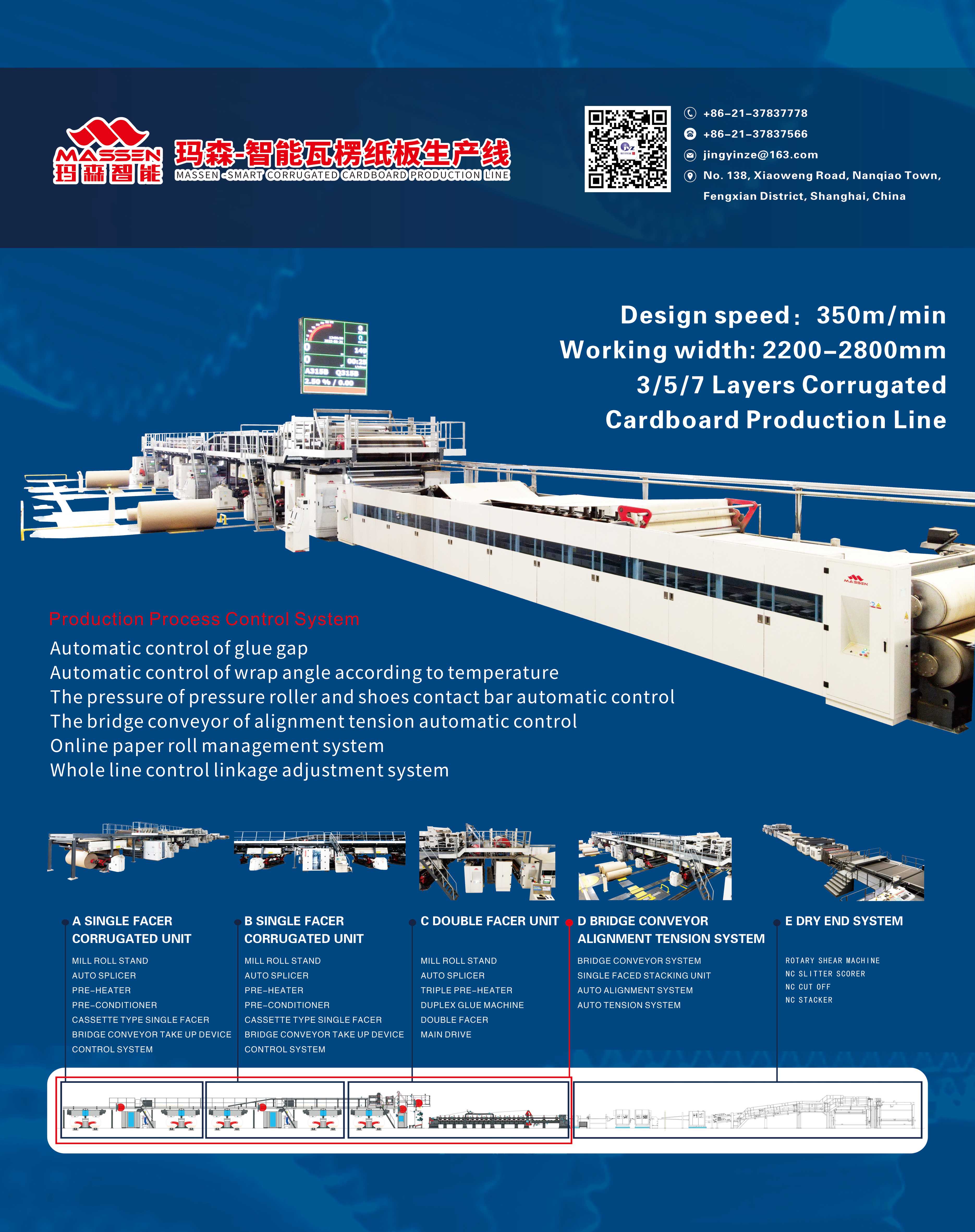 瓦楞纸板生产线由:原纸架、预热器、接纸机、单面瓦楞机、输送过桥、多重预热器、涂胶机、烘干定型系统、压线分纸机、横切机、堆码机、等设备组合而成。最初由原纸架输入卷形原纸.经过预热器加热及调节温度.进入单面瓦楞机.经过瓦楞机的滚轧成形,与另一面纸粘合成单面瓦楞纸,由输送过桥送纸,经多重预热器再次加热.经涂胶机涂胶再至烘干定型系统加热粘合.此时连续的瓦楞纸板即已成形。再经分纸机做纵向的分割及切断机横向的精确切断,从而生产出客户所需要各种规格的瓦楞纸板.最后由堆码机做堆叠整理及张数计算。公司生产的中、高档三、五、七层瓦楞纸板生产线生产幅宽为1800mm-2800m,生产速度为200m-350m/min,由用户按需选择。